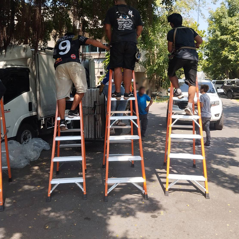 บันไดไฟเบอร์กลาสทรงเอขึ้นลงใช้งานได้ทั้ง 2 ด้าน ขาใหญ่พิเศษ เพื่อความแข็งแรง โครงสร้างผลิตจากไฟเบอร์กลาสสีส้ม นำเข้าจากอเมริกา