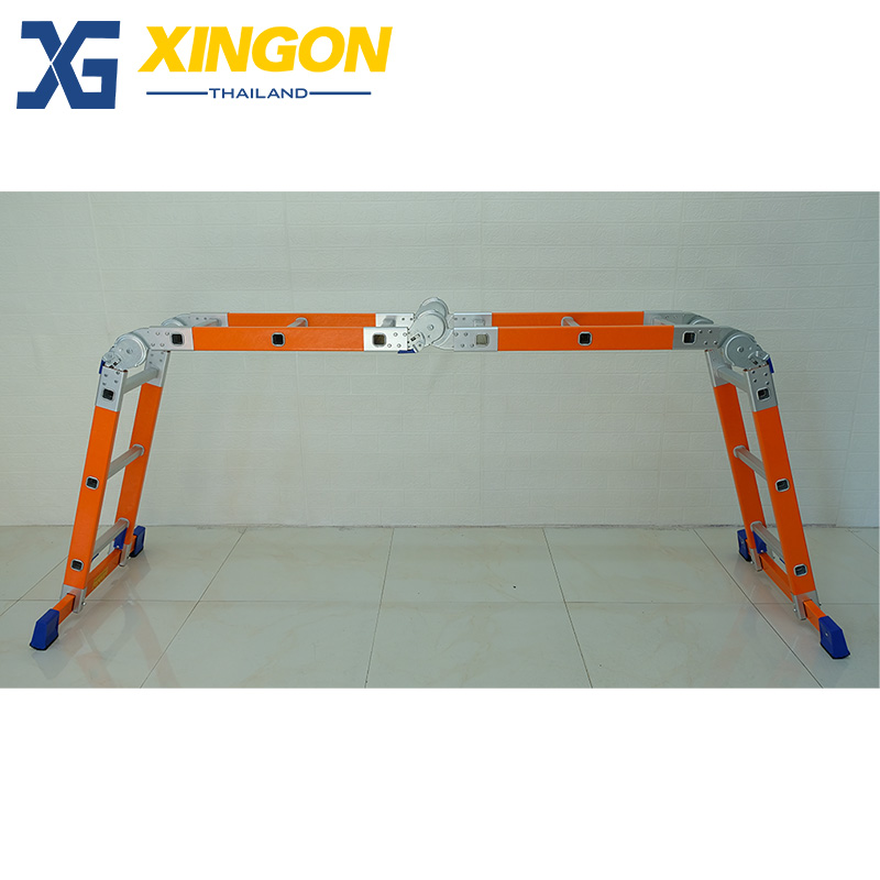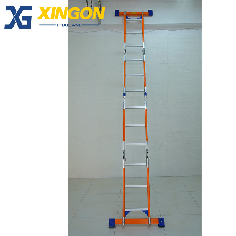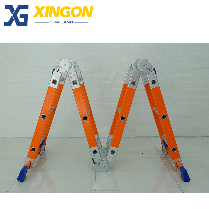 บันไดพับอเนกประสงค์ไฟเบอร์กลาสสีส้มพาดยาวสูง460ซม. ปรับการใช้งานได้มากกว่า 8 รูปแบบ มีความหนามากกว่าท้องตลาดทั่วไป ทนทาน แข็งแรง รับน้ำหนักได้ 150 kg. ไฟเบอร์กลาสช่วยต้านกระแสไฟฟ้า เหมาะสำหรับงานทั่วไปและงานช่างไฟ อลูมิเนียมหนา 1.5 มม. ไฟเบอร์กลาสหนา 3 มม. วัสดุนำเข้าจากอเมริกา