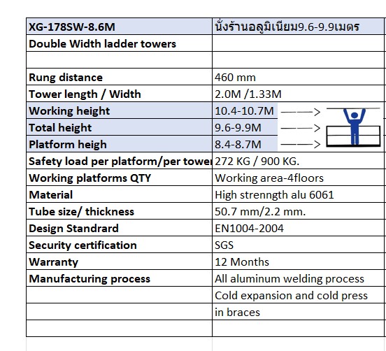 SKU: XG-178SW-8.6M Categories: นั่งร้านอลูมิเนียม, นั่งร้านอลูมิเนียมรุ่นXG-178SW