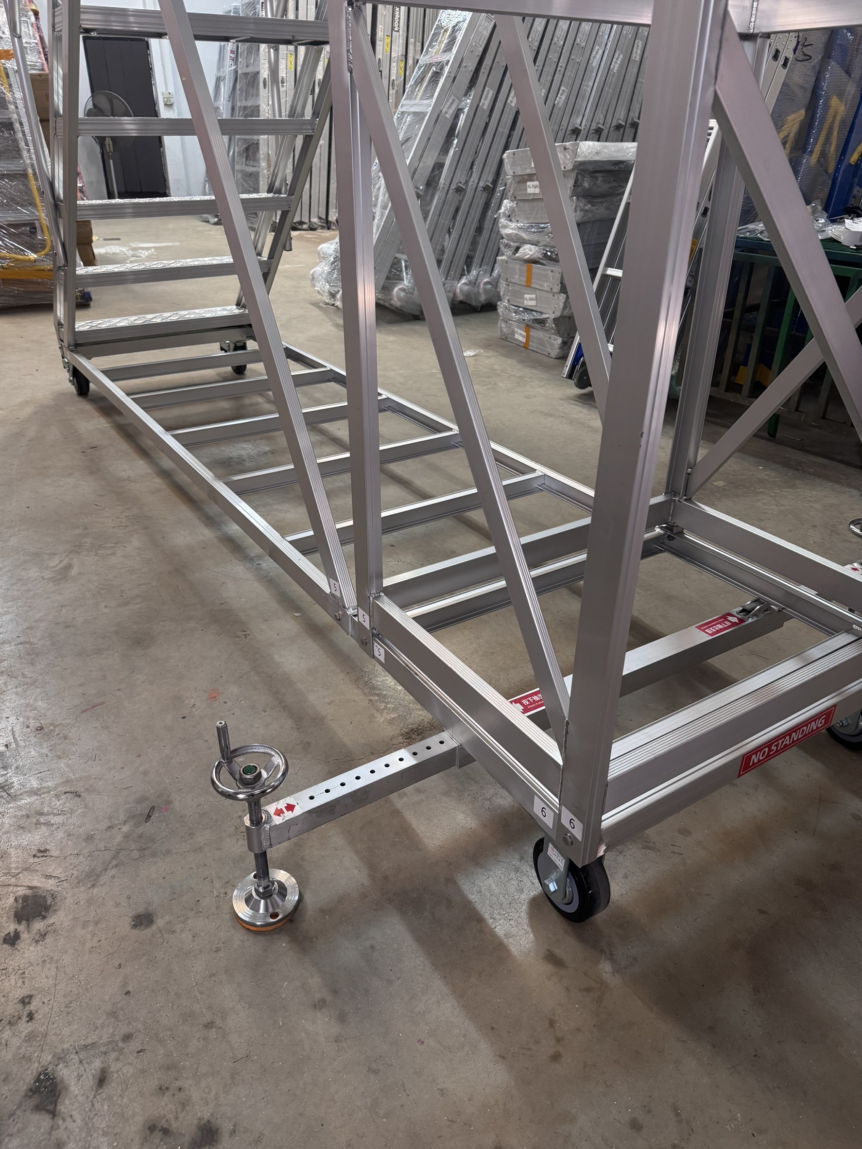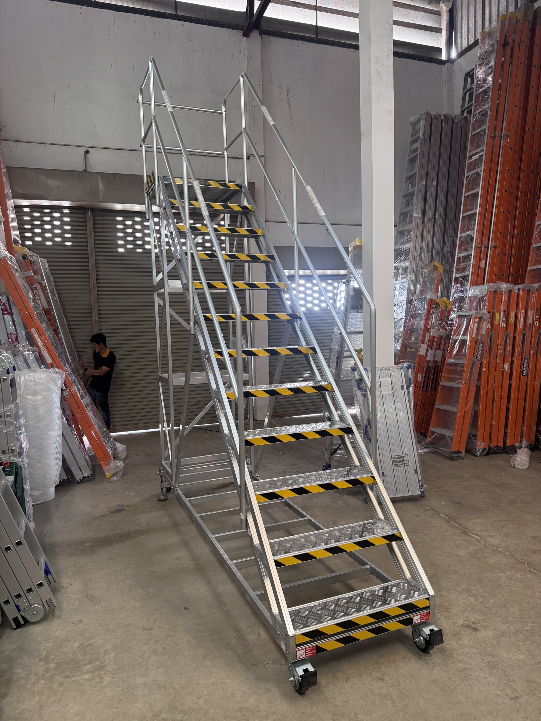 วัสดุบันไดทำจากอลูมิเนียมอัลลอยส์เคลือบสารป้องกันการเกิดคราบดำ จำนวนขั้นบันได 14+1ขั้น (15ขั้นรวมขั้นยืนบนสุด)ขั้นบันไดปั๊มลายนูนกันลื่นขณะใช้งาน มียาง4ล้อ บันไดอลูมิเนียมเซฟตี้ติดล้อเหมาะสำหรับใช้งานในโรงงานอุตสาหกรรม ที่ต้องการความปลอดภัยที่เป็นมาตรฐานโรงงาน บันไดเซฟตี้มีราวจับทั้ง2ด้านและราวกันตก เพื่อความปลอดัยในการใช้งาน แข็งแรง คงทน เหมาะต่อการใช้งานในพื้นที่รายเรียบไม่ขรุขระ อายุการใช้งานยาวนาน รับน้ำหนักได้ 350 กก. มีขาค้ำขยายได้ข้างละ 40 ซม. (ซ้าย40ซม. และ ขวา 40ซม.)